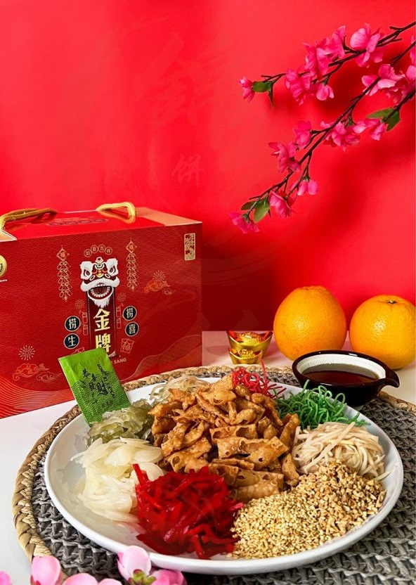 A premium prosperity salad platter made for sharing, featuring a vibrant mix of fresh, crunchy ingredients and festive toppings. Perfect for family gatherings — toss together for good luck, wealth, and abundance.