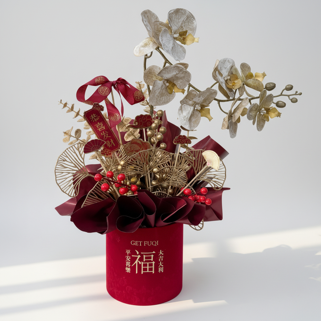 Symbolizing prosperity and good fortune, the Golden Blessing Artificial CNY Flower Box is designed in a classic Chinese New Year red theme, bringing festive warmth and auspicious energy.