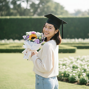 The All Set to Soar Graduation Hand Bouquet features a bold sunflower, symbolizing success and bright beginnings, paired with elegant Kenya white roses and soft lilac eustoma for a gentle, uplifting touch. Delicate Hannah blooms, white spray carnations, and whimsical purple caspia add texture and charm, while eucalyptus brings a soothing green finish.