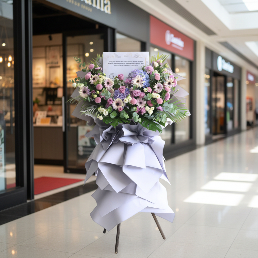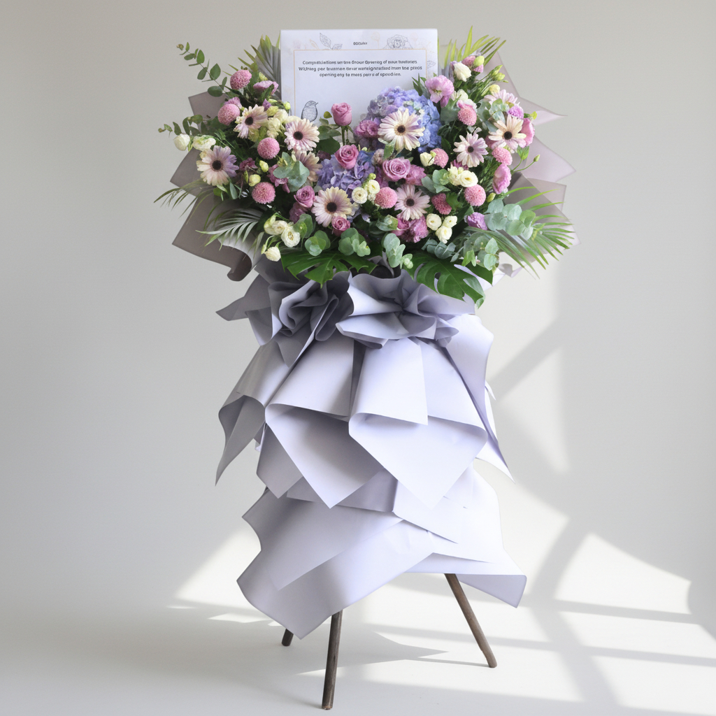 Purchase & earn 768 points!The Aspire to Greatness Business Opening Stand (Premium Selection) is a sophisticated and refined arrangement, perfect for celebrating a monumental milestone. Featuring regal purple roses, soft lilac eustomas, and elegant lilac hydrangeas, this stand exudes a sense of ambition and prestige. Lilac ping pong flowers add playful texture, while white daisies and white eustomas introduce a refreshing contrast. Complemented by lush foliage and eucalyptus, all wrapped in sleek bluish-grey tones, this stand is an impeccable symbol of aspiring towards greatness and future success. πΏπβ¨