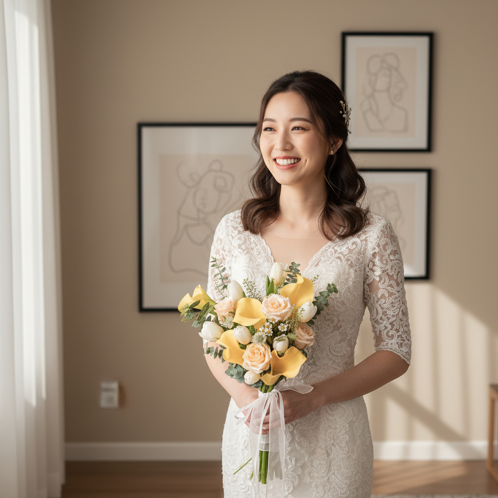 Purchase & earn 320 points!Begonia bridal bouquet come with 5 calla lily, 4 champagne rose, 7 white tulip, matricaria, astrantia, thalapsi green bell & eucalyptus baby blue.