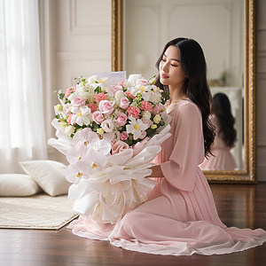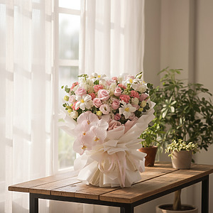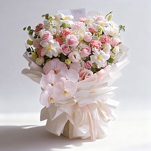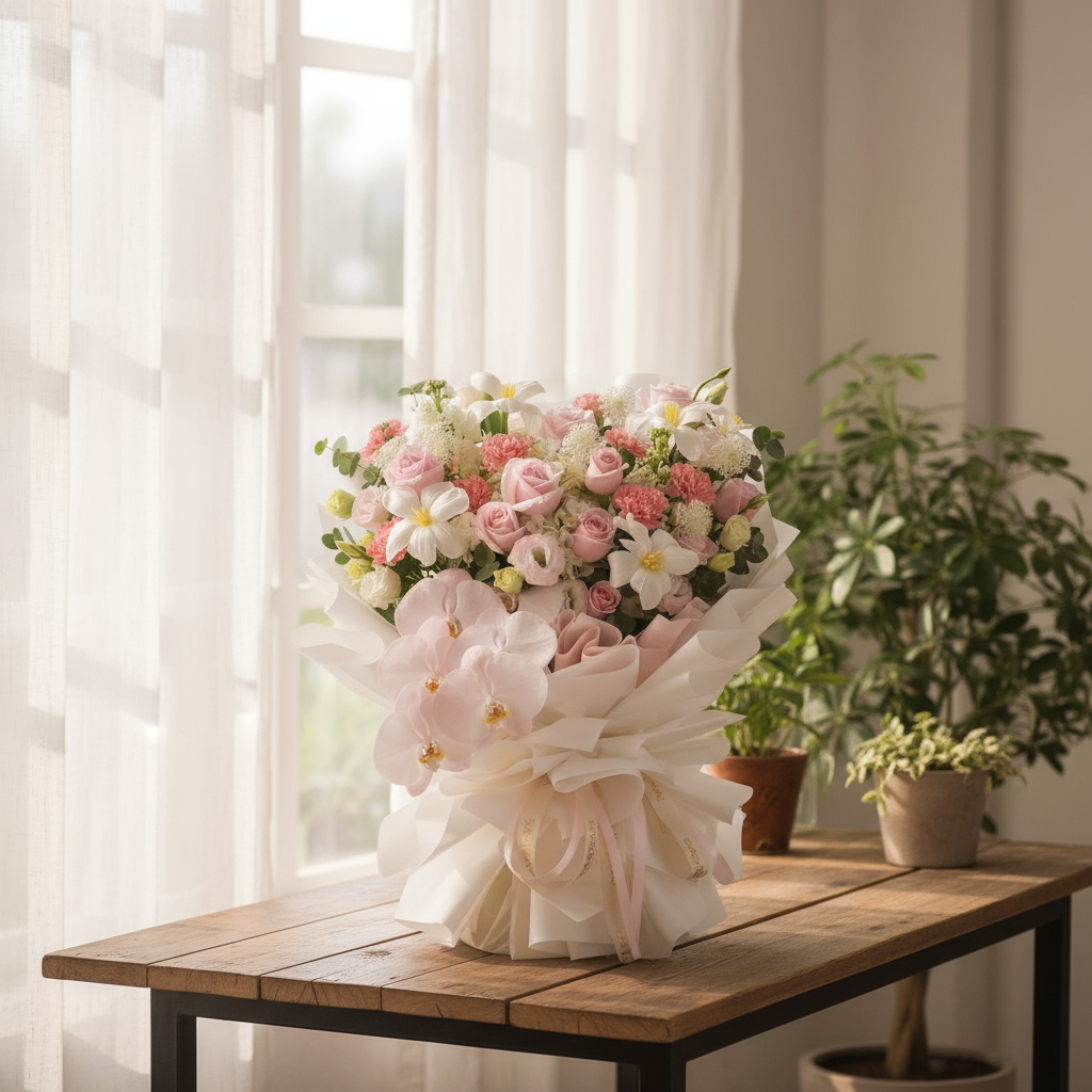 Delicate accents of pink roses and pink carnations introduce a romantic blush, while white eustoma and dainty lace flowers add a whimsical, airy touch. Framed by lush foliages, this arrangement is both graceful and serene.