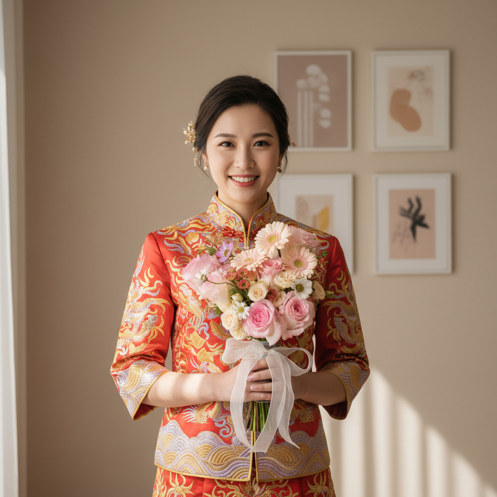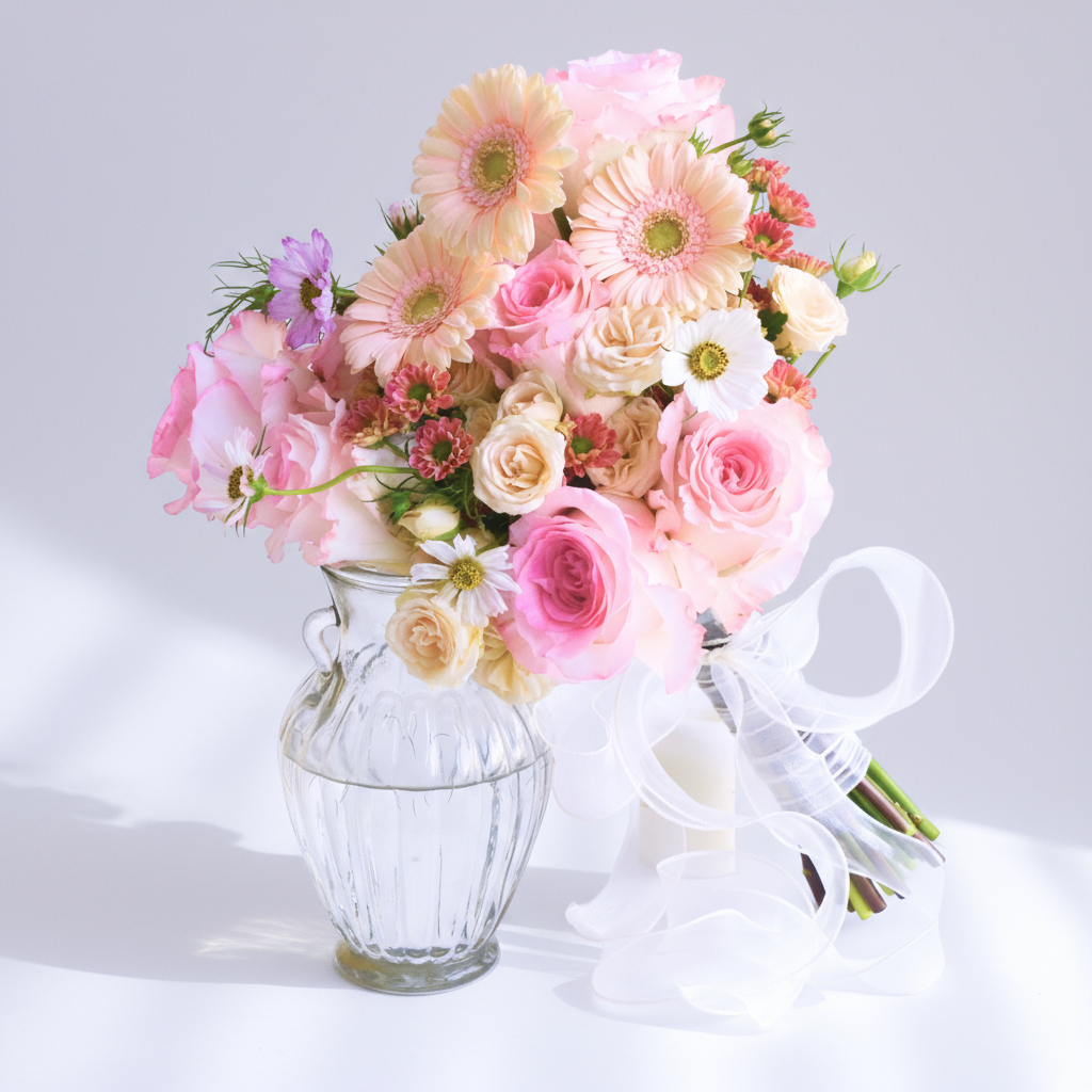 The pink roses symbolize admiration and gratitude, while the champagne daisies add a touch of cheer and innocence. Together, they form a bouquet that reflects the tender emotions and the beginning of a beautiful journey into matrimony.