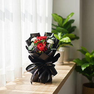 This Mini size bouquet comes with Red Rose x 2, Spray Carnation White x 2, Red Berry, Caspia Purple & Eucalyptus.