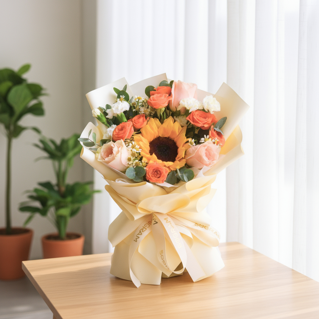 The sunflowers, with their golden petals, symbolize success, growth, and the bright path that lies ahead for the graduate. The pink roses add a touch of sweetness and affection, while the orange spray roses infuse the bouquet with energy and enthusiasm.