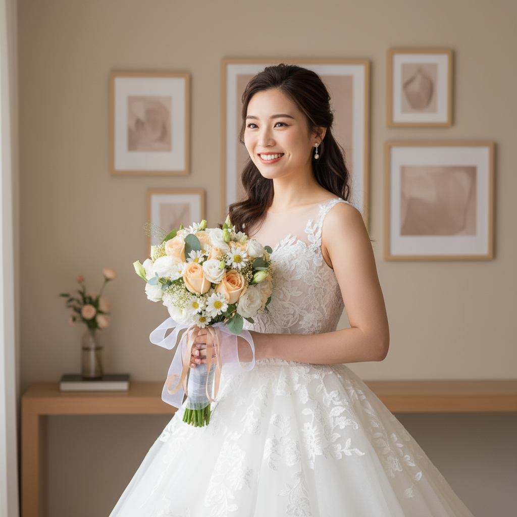 Purchase & earn 328 points!The “Creamy Radiance Bridal Bouquet” is an elegant and timeless arrangement featuring soft champagne roses, delicate white eustoma, and graceful hana white flowers. This bouquet exudes sophistication and grace, with its creamy tones and gentle textures creating a perfect, understated look for a bride who desires a classic and refined appearance on her special day. š¹š¤š
