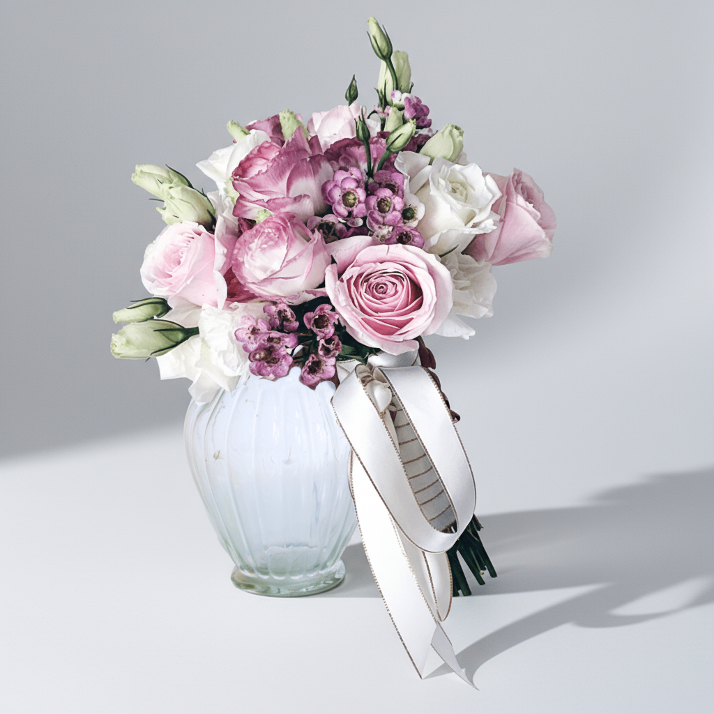 Purchase & earn 258 points!Delilah come with 7 pink roses, 5 white roses, 5 wax flowers, 5 pink-white eustomas, & 4 white eustomas.