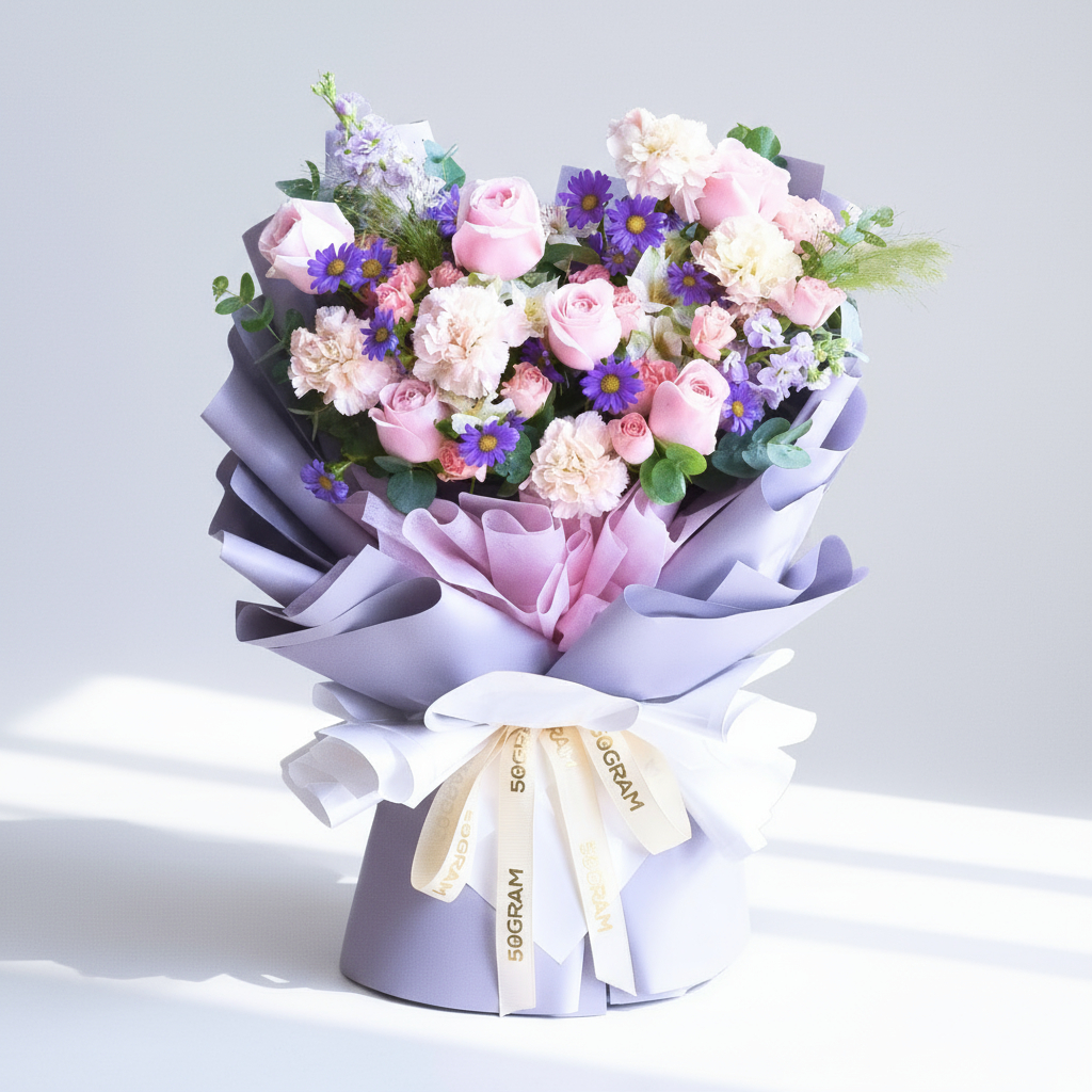 At the center are graceful pink roses and sweet pink spray roses, softened by the earthy tones of brut carnations and the delicate charm of white alstroemeria. Touches of purple hannah and lilac matthiola bring depth and mystery, while fountain panicum and eucalyptus cineria add gentle movement and a silvery-green finish.