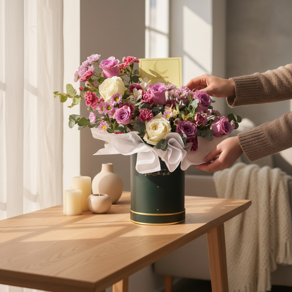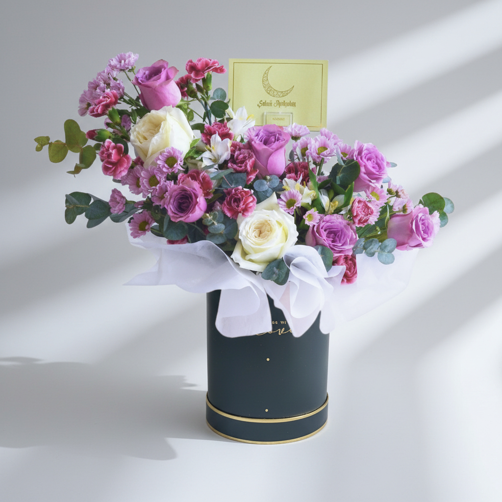 Presented in an elegant flower box, this arrangement is not just a collection of flowers; it’s a thoughtful expression of beauty and reverence for the sacred occasion. The “Eid Elegance Ramadan Flower Box” is a perfect gift to share blessings, convey good wishes, and add a touch of floral elegance to the festive celebrations. 🌹💜🌼