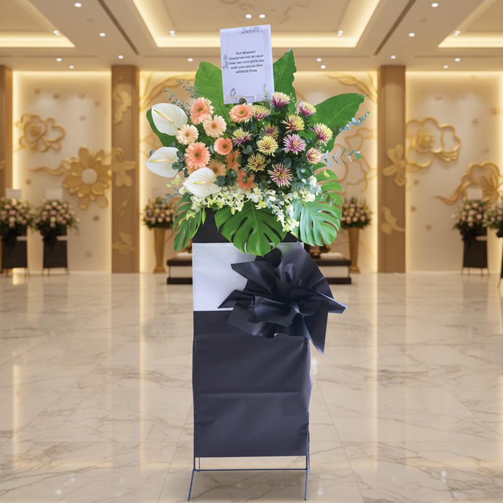 Honor cherished memories with our purple-themed condolences stand flower, elegantly presented on a steel stand. This arrangement showcases the delicate beauty of purple net mums and lilac ping pong flowers, accompanied by the graceful presence of cineria and white orchids. Enhanced by the enchanting gerbera green eye, cascading caspia, and the verdant touch of rainforest leaves, it creates an ethereal tribute that offers solace and serenity, expressing condolences with grace and reverence.