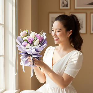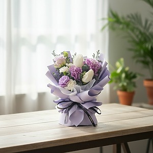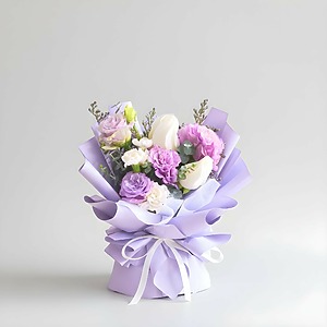 Purchase & earn 100 points!A perfect tribute to femininity and elegance, the Feminine Grace Mini Hand Bouquet celebrates International Women’s Day with timeless charm. Featuring pristine white roses, soft lilac eustoma, and delicate white spray carnations, this bouquet is beautifully accented with purple caspia and lush foliage. Wrapped in a graceful purple wrap, it embodies beauty, strength, and the essence of womanhood.