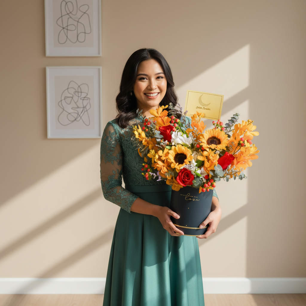 Celebrate the essence of Ramadan with the Fitrah Fleurs Ramadan Flower Box, a vibrant arrangement that embodies joy, renewal, and reflection. This exquisite flower box showcases a radiant sunflower as the centerpiece, symbolizing warmth and hope. Deep red roses represent love and unity, while cheerful yellow orchids and delicate white alstroemeria bring a sense of serenity. Accented with rich red berries, soft purple caspia, and light touches of baby blue florals, this composition exudes harmony and peace. Presented in an elegant champagne flower box, it makes for a stunning display and a meaningful gift to share during the holy month of Ramadan, bringing blessings and beauty to any space.