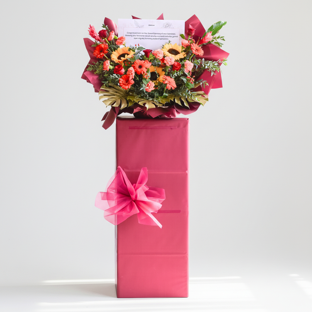 Design Note: Presented with a striking bottom red carton box, this floral stand exudes confidence and festive brilliance.