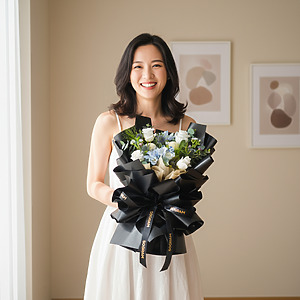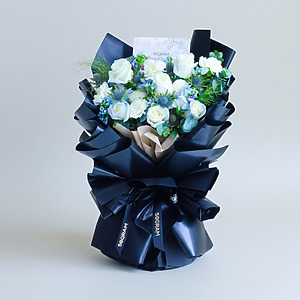 Present this bouquet to someone special or use it to create a serene and elegant atmosphere, allowing the soft blue and white blooms to fill your space with peace and grace.