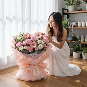 This bouquet comes with Pink Daisy x 3, Pink Rose x 5, Pink Carnation x 5, White Alstroemeria, White Eustoma, Red Berry & Eucalyptus.