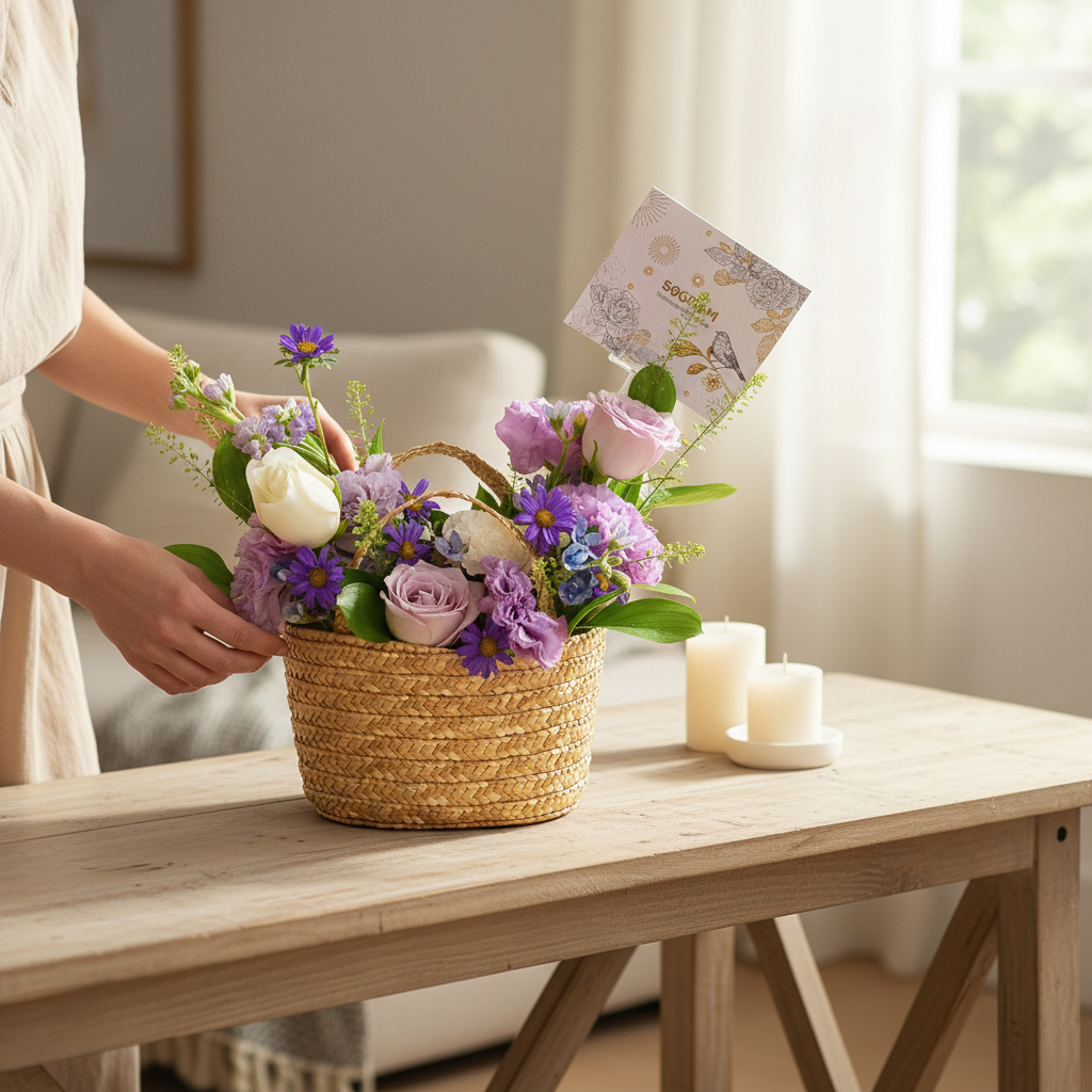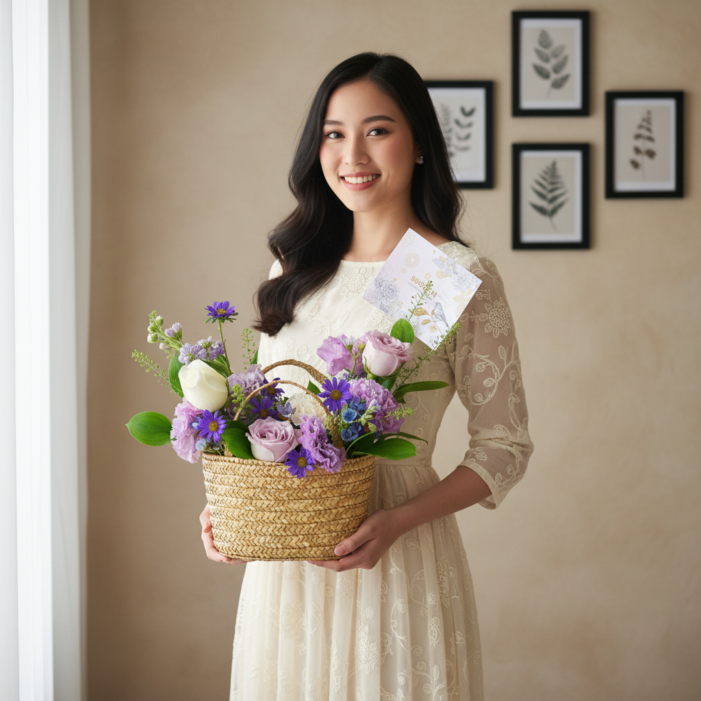 Thoughtfully arranged in a flower basket, Graceful Garden is perfect for celebrations, heartfelt gestures, or as a timeless centerpiece that brings calm elegance to any space.