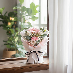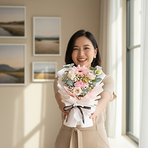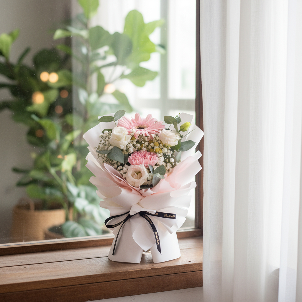 Purchase & earn 100 points!Celebrate the beauty and resilience of women with the Graceful Strength Mini Hand Bouquet. Featuring soft pink daisies, elegant white eustoma, delicate baby’s breath, and charming chamomile, this bouquet symbolizes grace and fortitude. Accentuated with fresh foliage and wrapped in a pristine white wrap, it’s a perfect gesture to honor and uplift the remarkable women in your life this International Women’s Day.