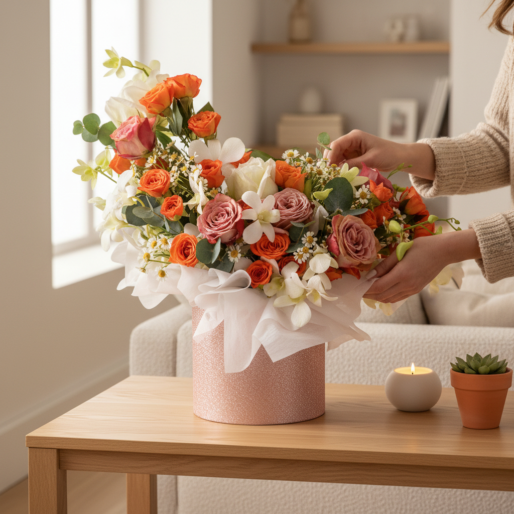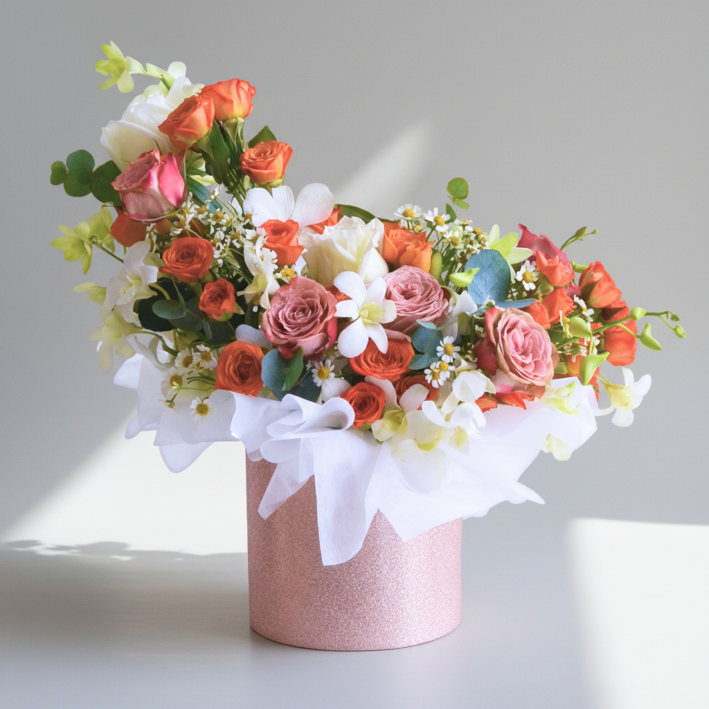 This flower box comes with White Rose x 2, Cappuccino Rose x 5, Spray Rose Orange x 3, White Orchid x 3, Chamomile & Eucalyptus Cinerea