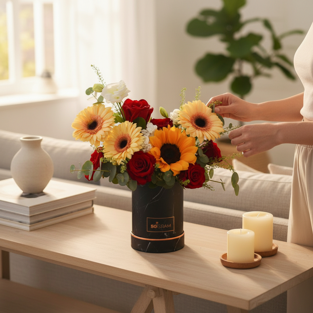 The stylish box adds a touch of luxury and sophistication to the arrangement, making it a perfect centerpiece or decoration for any occasion. The Karima Champagne Gerberas Flower Box is an excellent choice for birthdays, anniversaries, or any other special occasion.