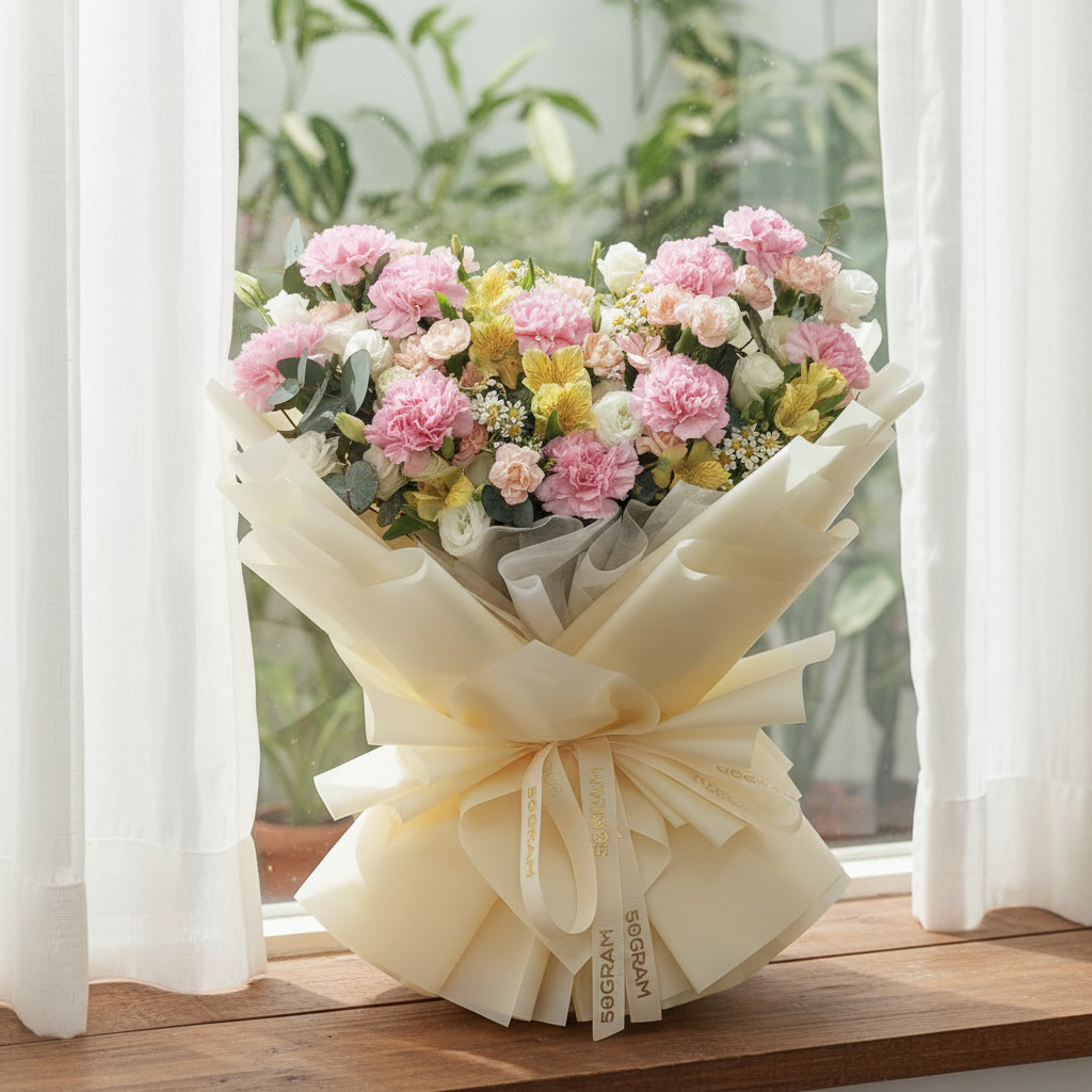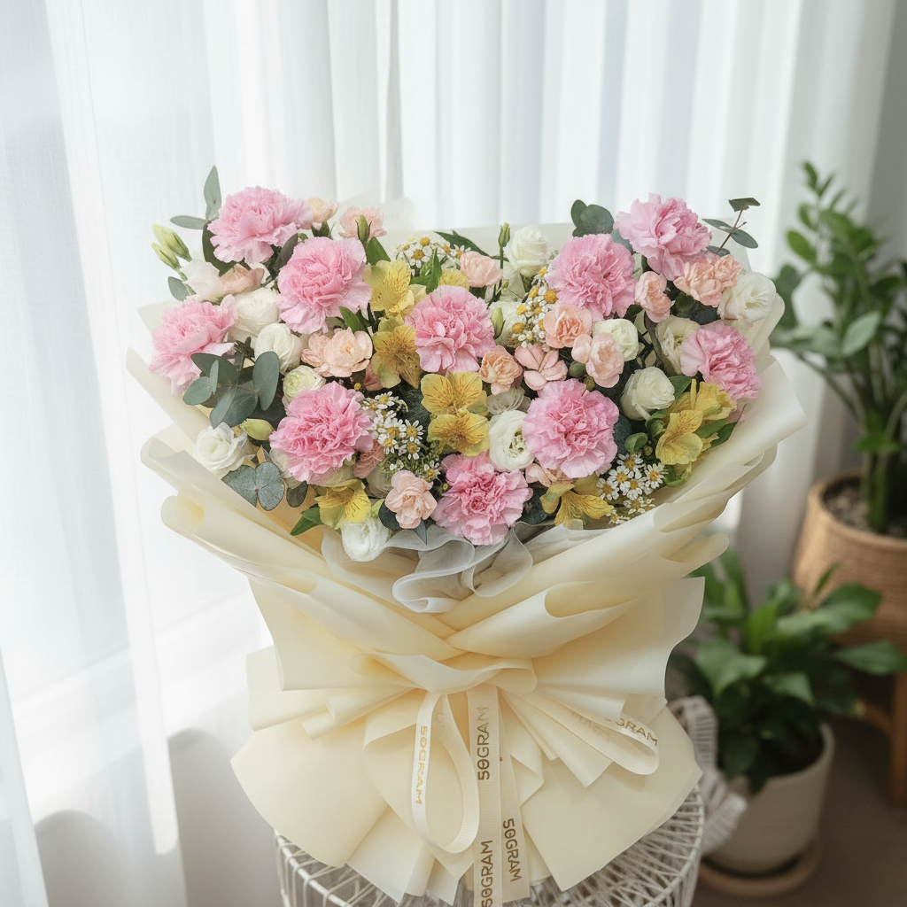 Featuring delicate pink carnations symbolizing admiration, paired with cheerful yellow alstroemeria for friendship and happiness, this bouquet is beautifully balanced with elegant white eustoma for a touch of purity. Accents of champagne spray carnations and fresh chamomile add texture and charm, while eucalyptus cinerea brings a natural, calming finish.