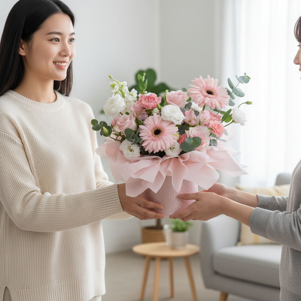 The pink daisies, with their cheerful blooms, represent joy, gratitude, and the everlasting bond between mother and child. Paired with the tender beauty of pink roses, symbolizing admiration and appreciation, and the elegance of white eustoma, the arrangement becomes a heartfelt expression of love and gratitude.
