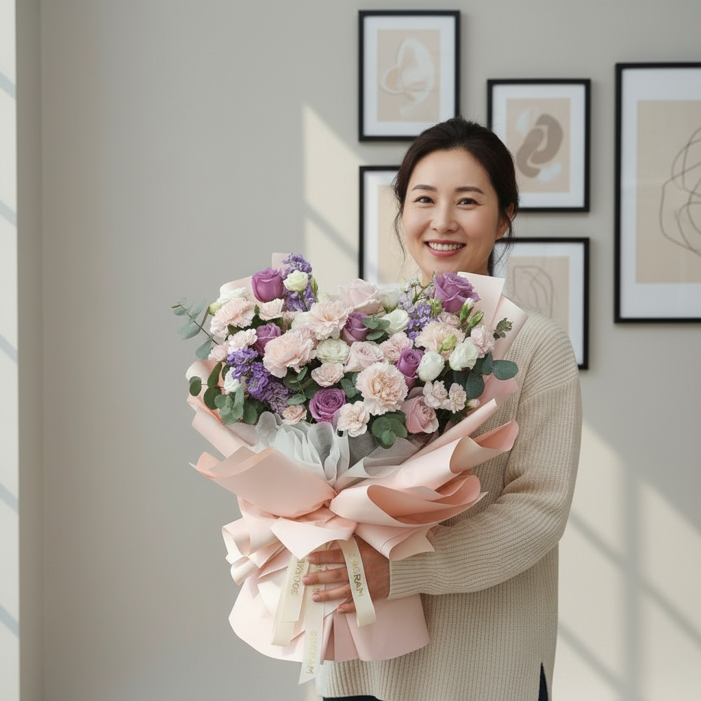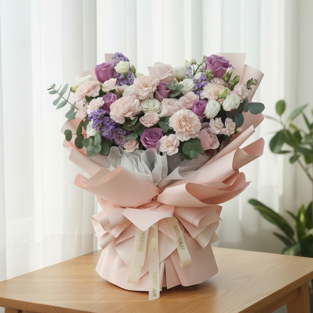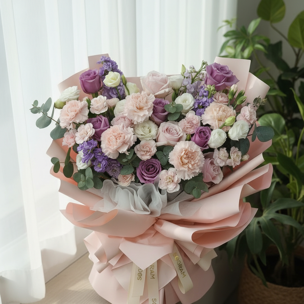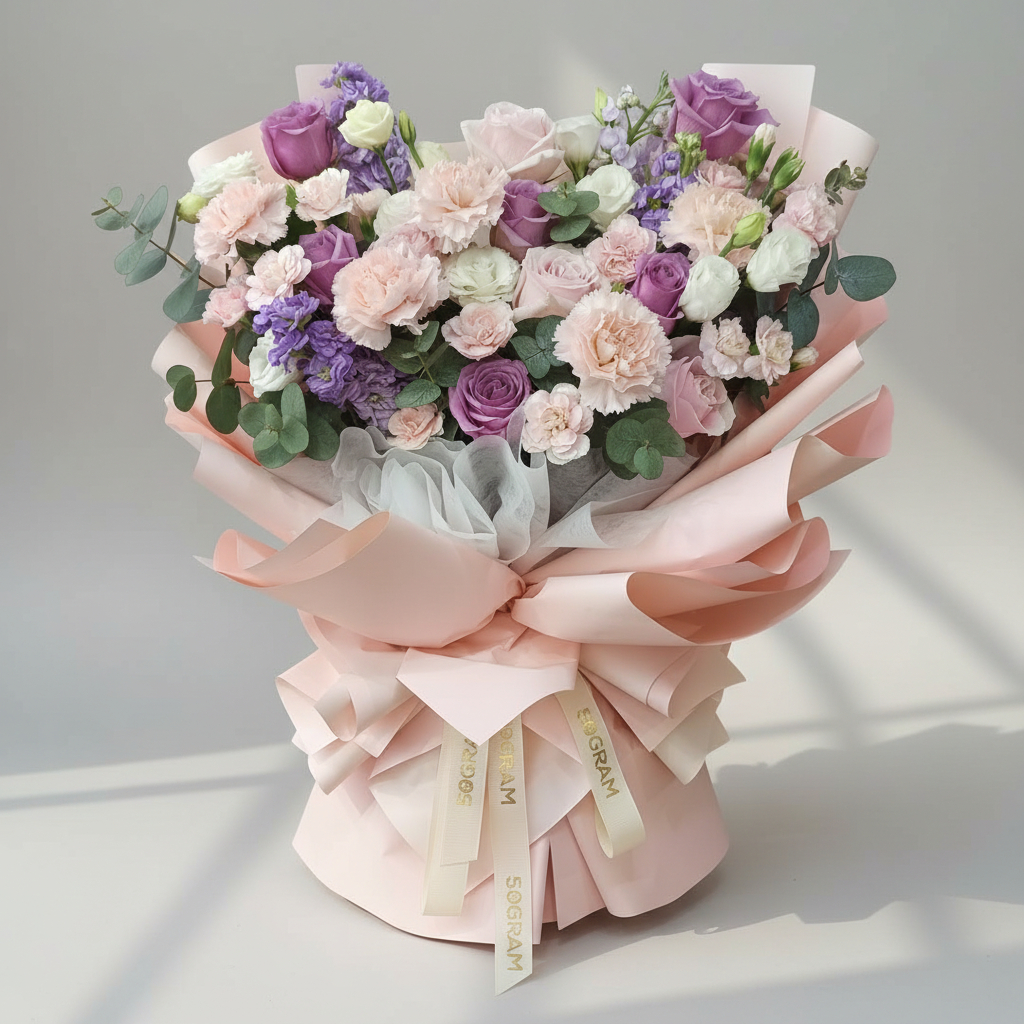 Featuring a harmonious blend of purple roses and pink roses, this bouquet exudes elegance and charm. Brut carnations and pink spray carnations add softness and texture, while lilac matthiola brings a delicate fragrance and dreamy touch. Accents of white eustoma enhance the arrangement with purity, and eucalyptus cinerea completes the look with a fresh, natural finish.