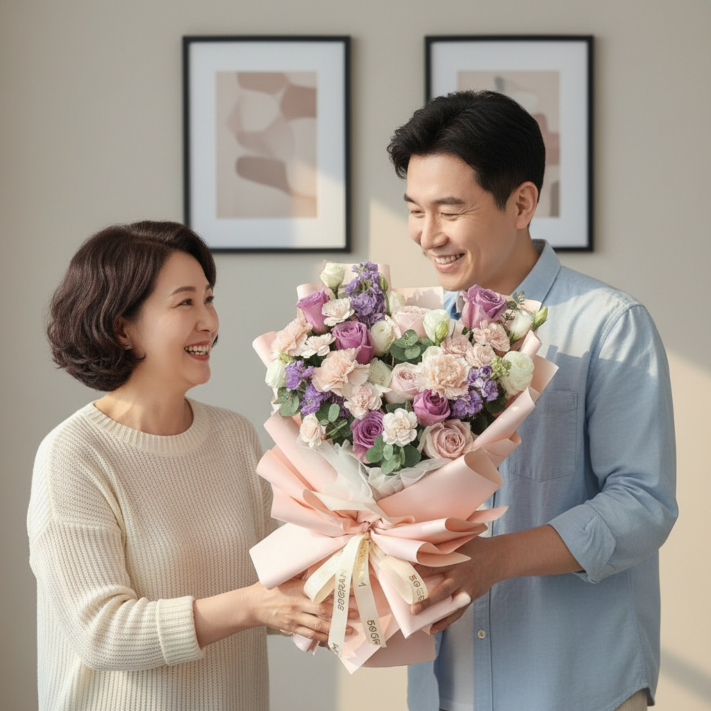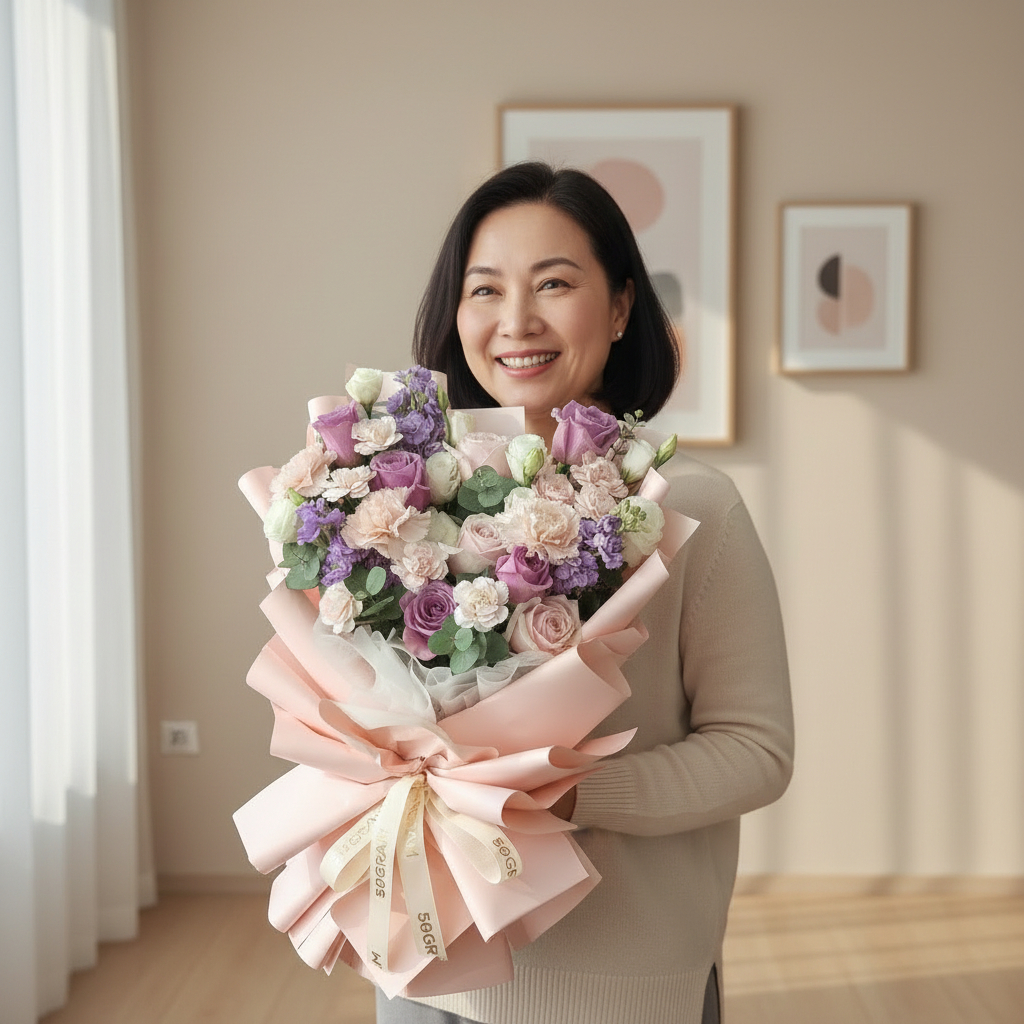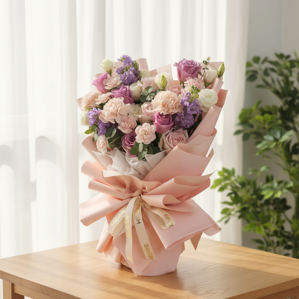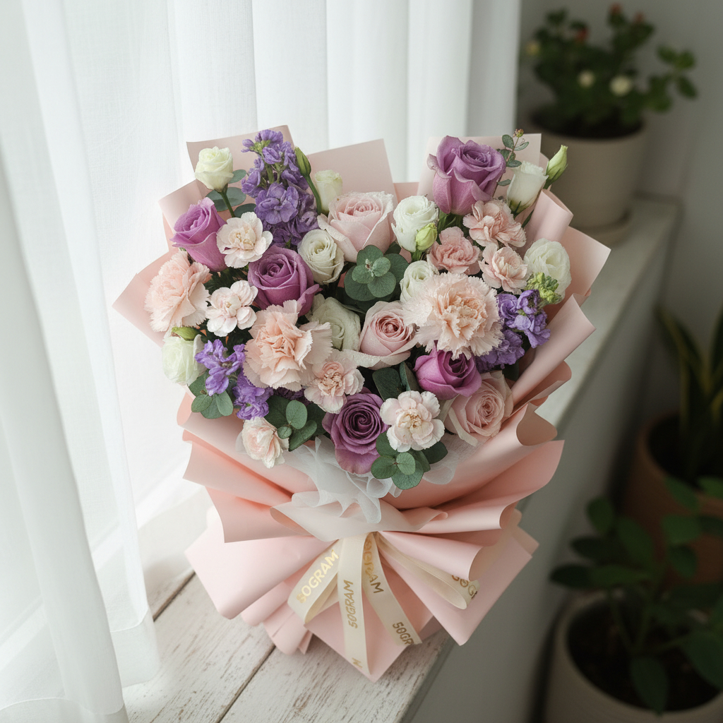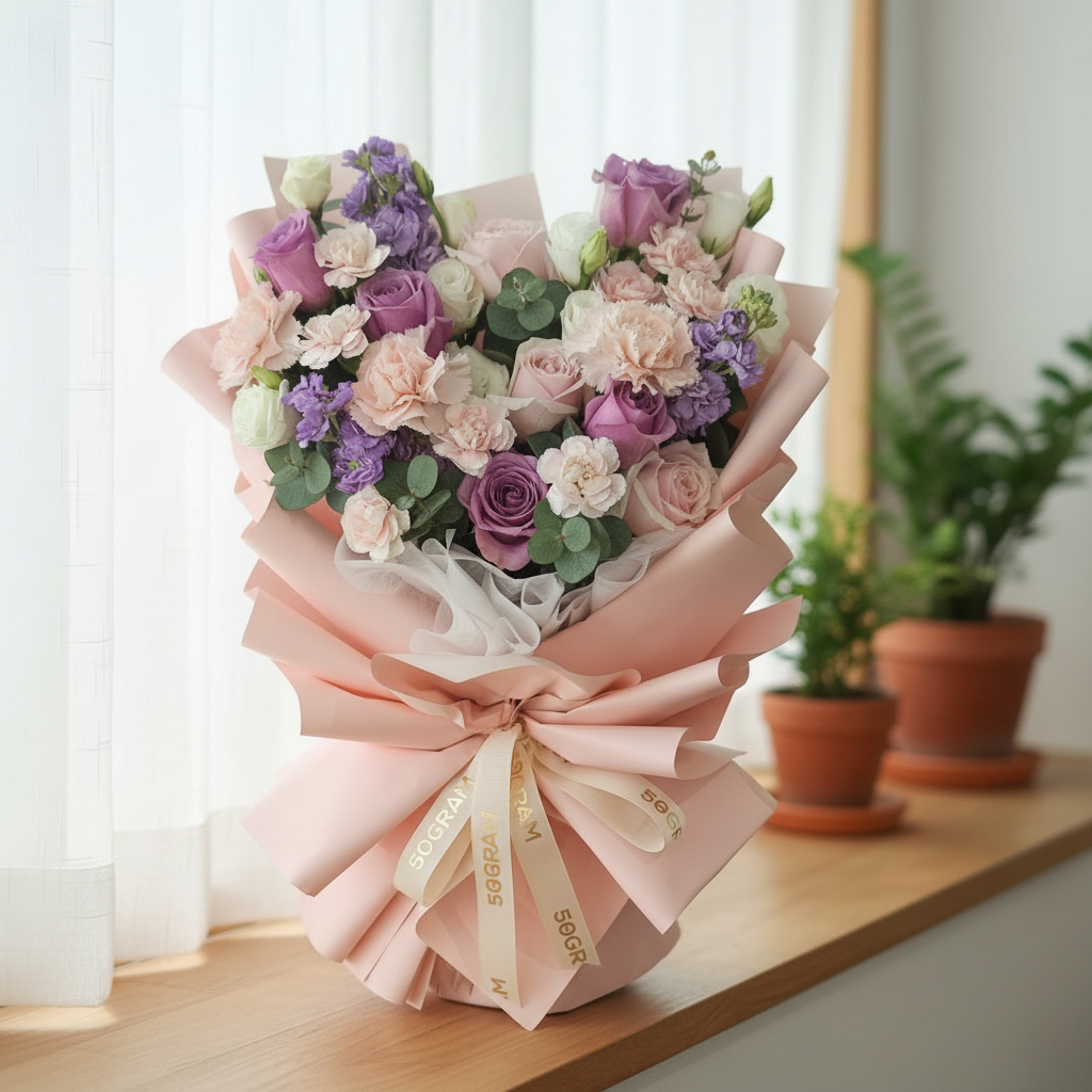 Featuring a harmonious blend of purple roses and pink roses, this bouquet exudes elegance and charm. Brut carnations and pink spray carnations add softness and texture, while lilac matthiola brings a delicate fragrance and dreamy touch. Accents of white eustoma enhance the arrangement with purity, and eucalyptus cinerea completes the look with a fresh, natural finish.