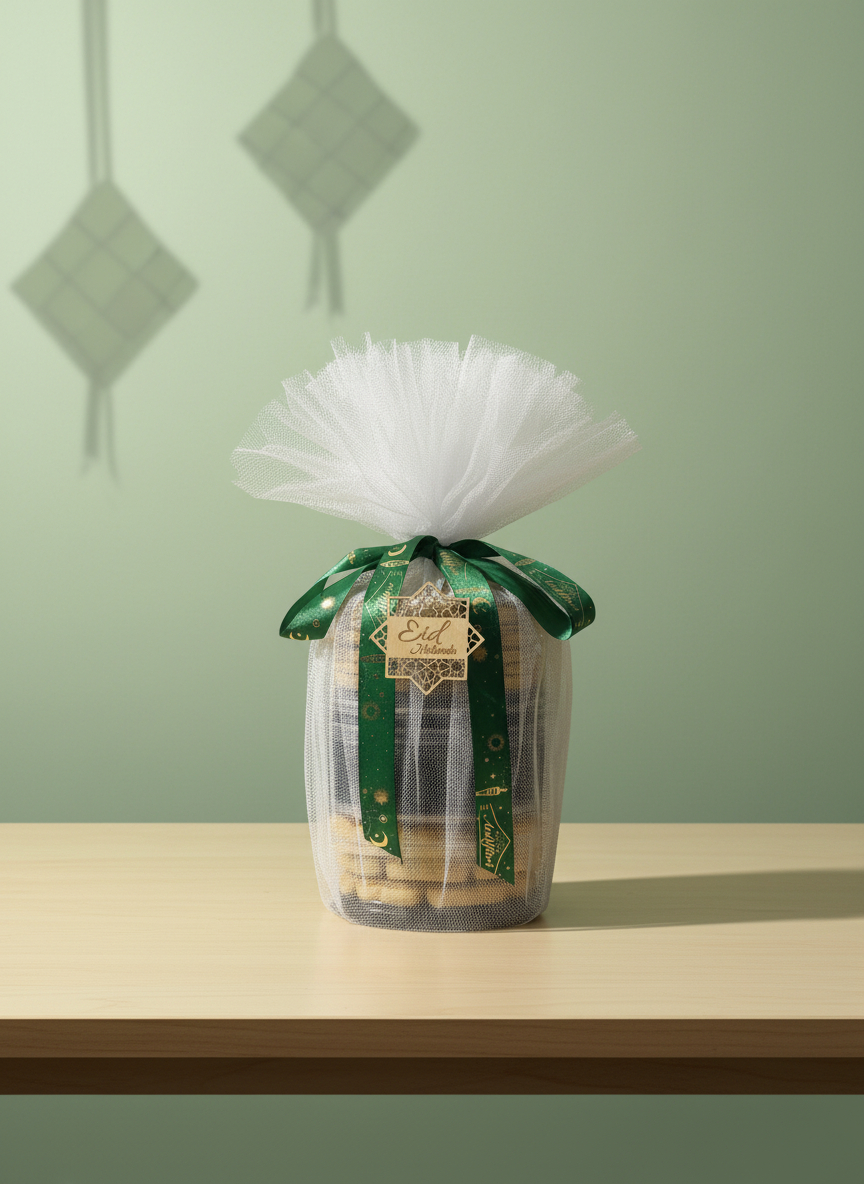 Santapan Warisan Raya is inspired by the traditional festive trays that adorn living rooms during Syawal. This set features three assorted Raya cookies individually wrapped in sheer white netting and finished with a delicate ribbon, reflecting the softness and elegance of the festive season.