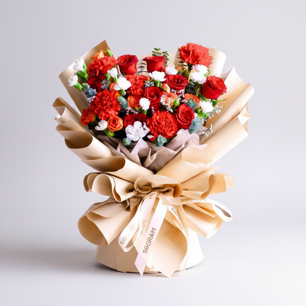 The deep crimson tones of the red roses evoke feelings of passion, desire, and romance, making a bold statement that commands attention. Paired with the vibrant bursts of orange from the spray roses, representing enthusiasm and vitality, and the lush red carnations, the bouquet becomes a dynamic fusion of colors and textures.