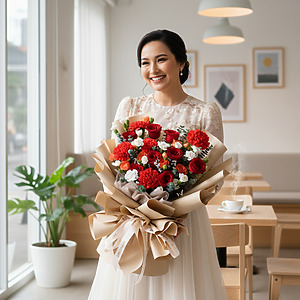 Large Size comes with Kenya Red Rose x 8, Red Carnation x 5, Spray Rose Orange x 3, Spray Carnation White, Caspia White & Eucalyptus.