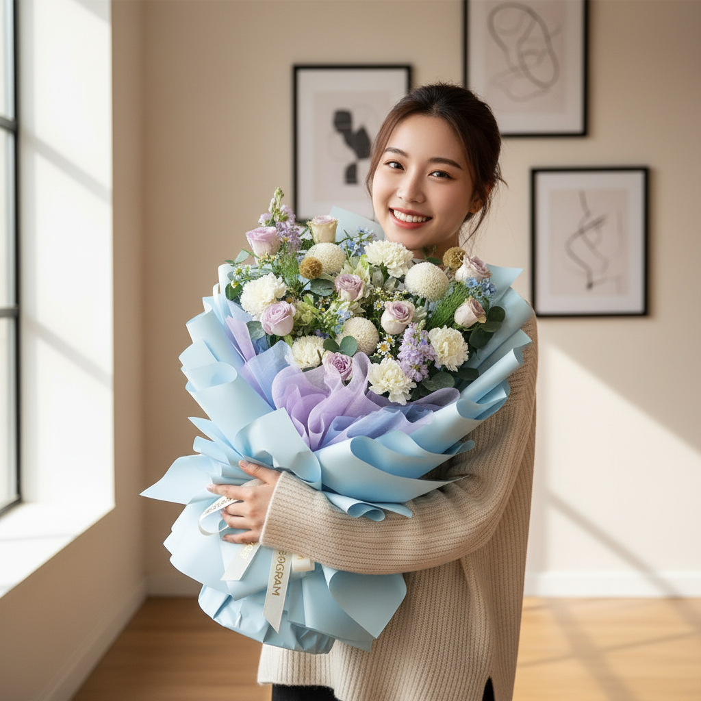 Inspired by the delicate hues of a quiet spring morning, the Soft Wisteria Hand Bouquet is a serene arrangement wrapped in dreamy light blue paper. This bouquet evokes softness and calm, with a thoughtful mix of muted purples, soft whites, subtle blues, and earthy textures.