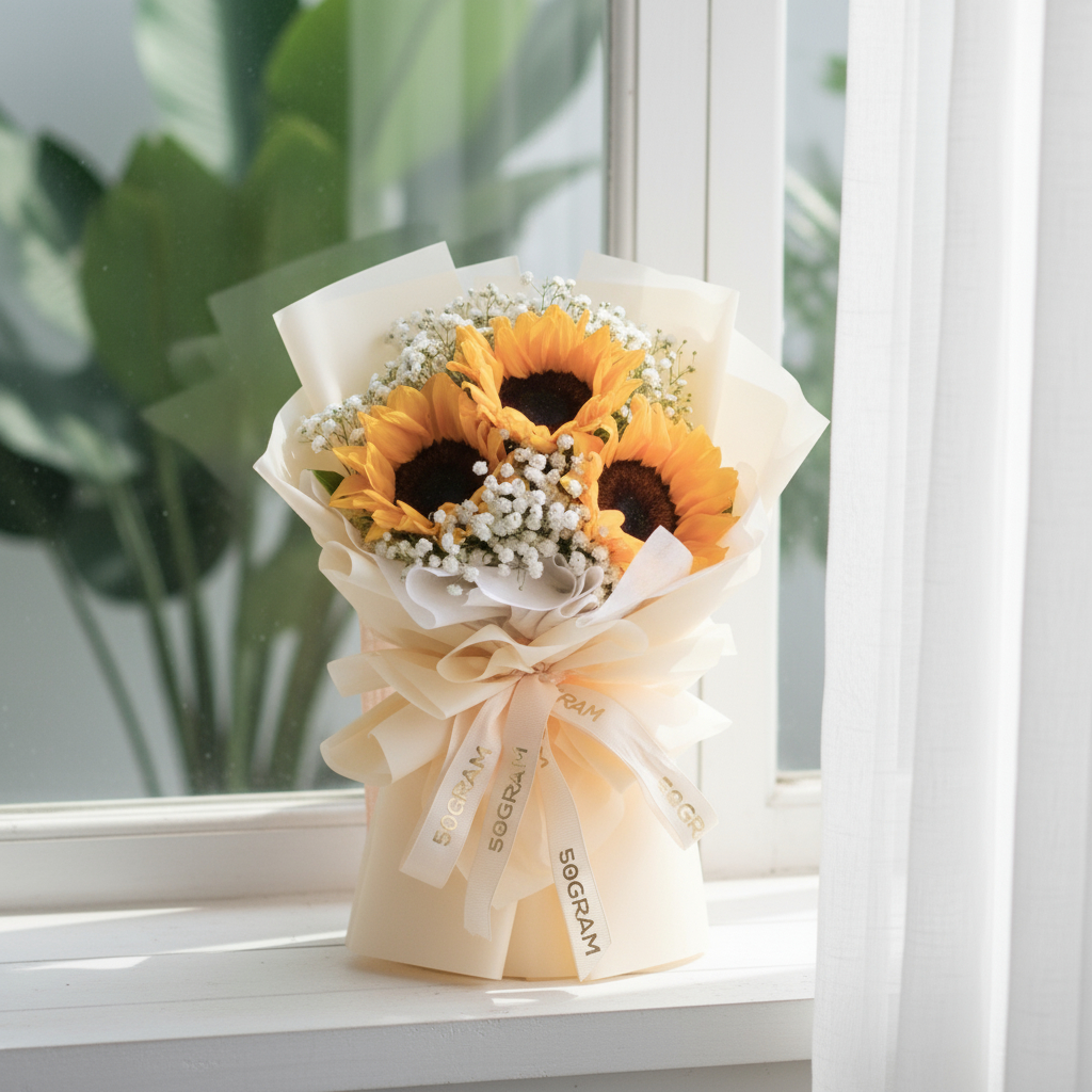 Regular Size: Sunflower (3 stalks), White Baby Breath, Champagne Wrapping
