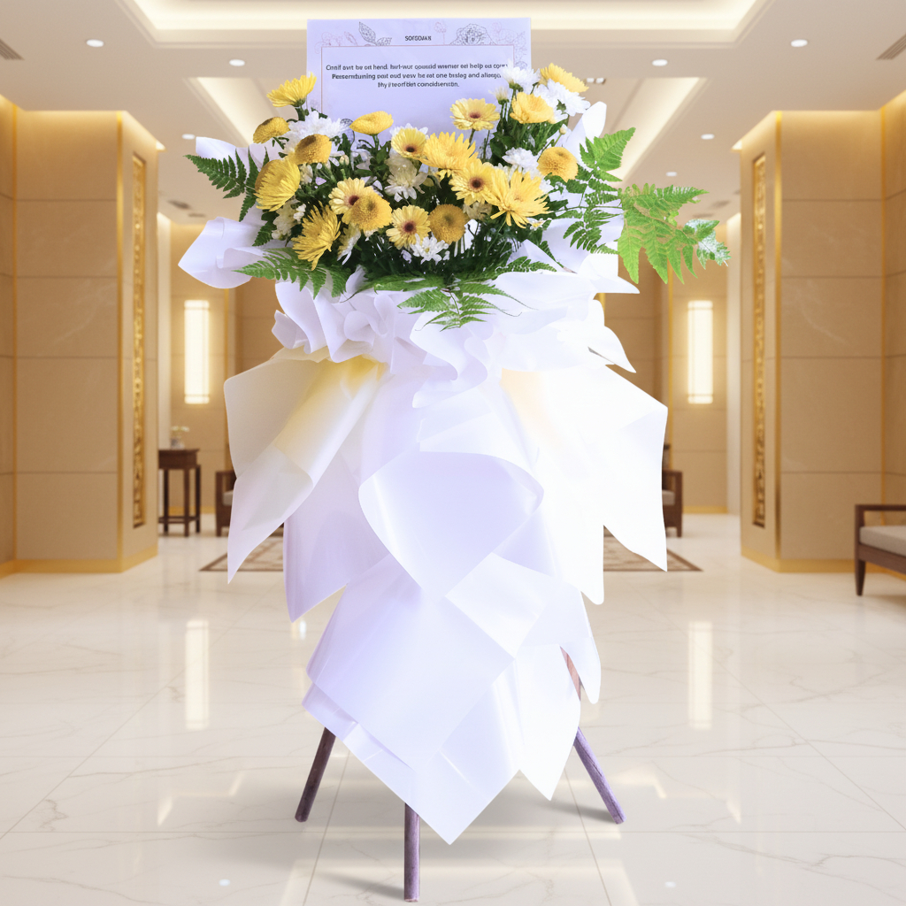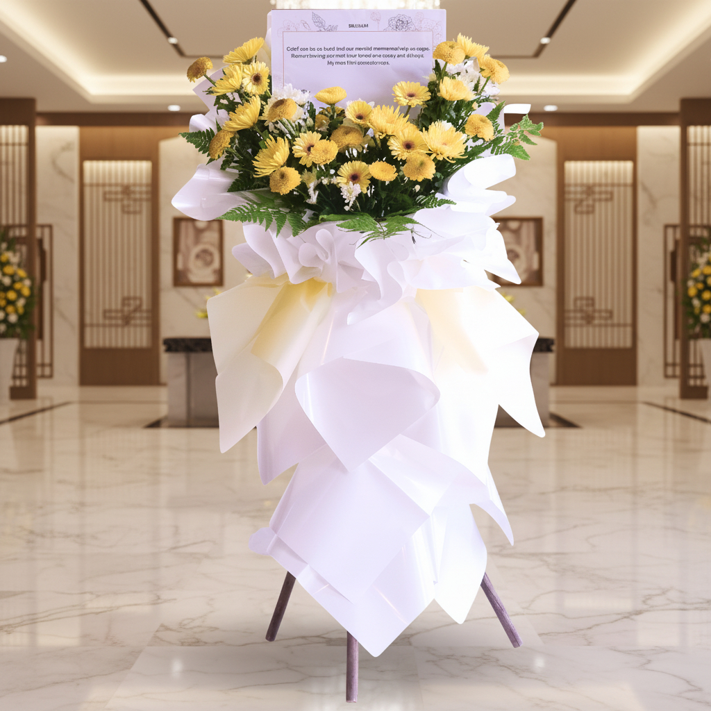 Embrace the warmth of our yellow-themed condolences stand flower elegantly wrapped in a dress wrapping paper. This arrangement showcases the delicate beauty of pom pom white flowers, accompanied by the vibrant hues of yellow and red ping ping blooms. Enhanced by the gentle presence of yellow net mums, paku leaves, and rainforest leaves, it creates a serene and comforting tribute that brings solace and light during moments of condolences.