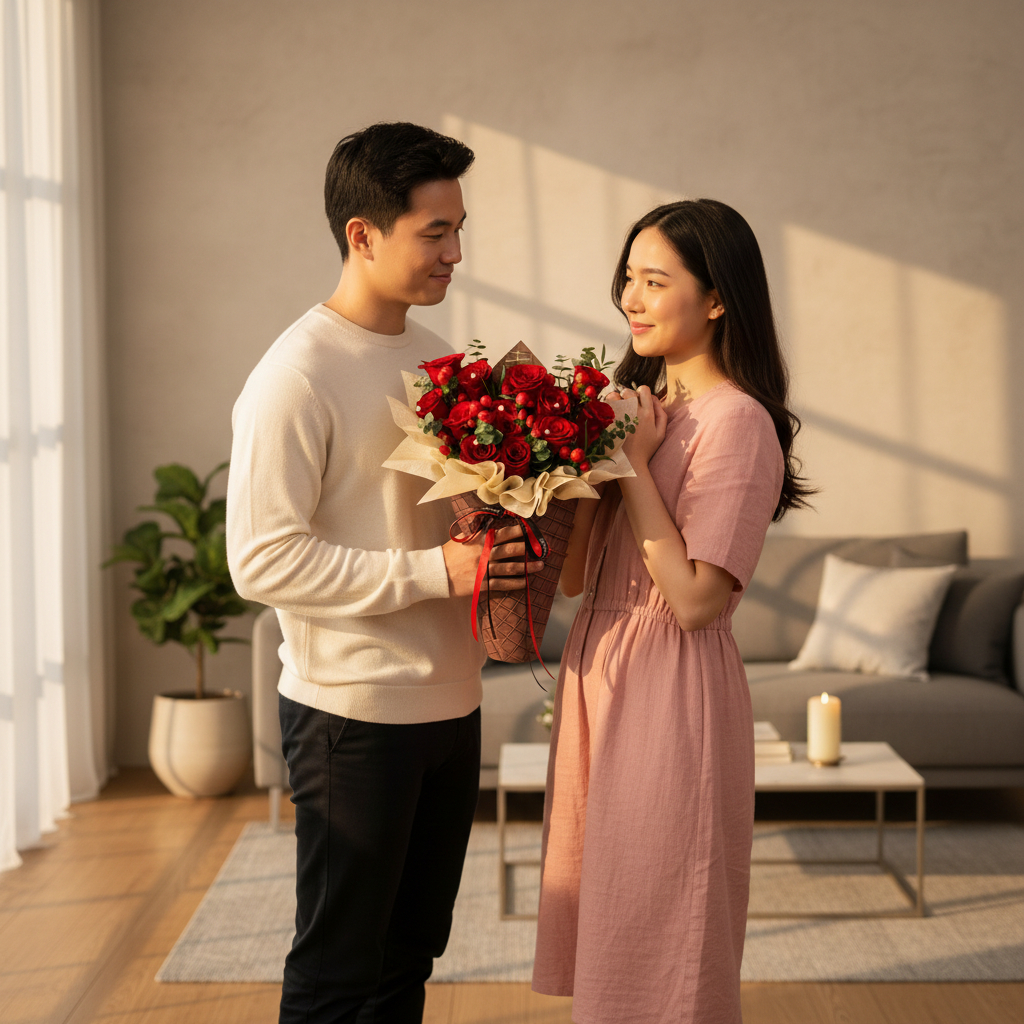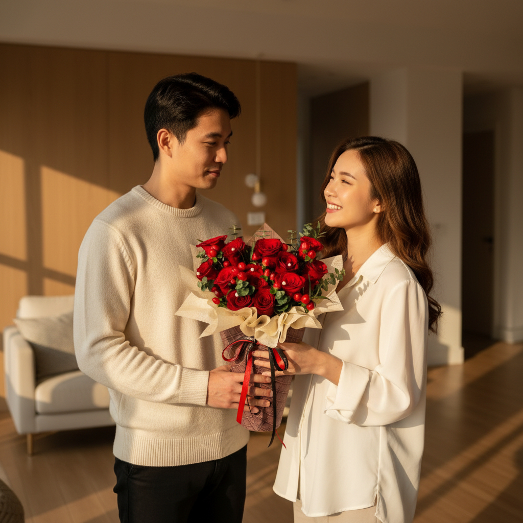 Classic red roses take center stage, symbolizing deep passion, gently complemented by soft white eustoma for purity and grace. Pink spray roses add a tender romantic touch, while delicate red berries bring warmth and charm to the arrangement.