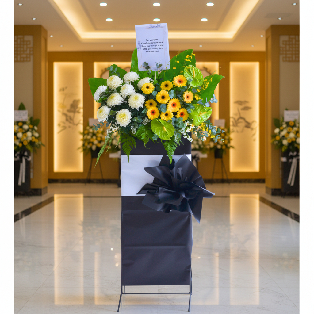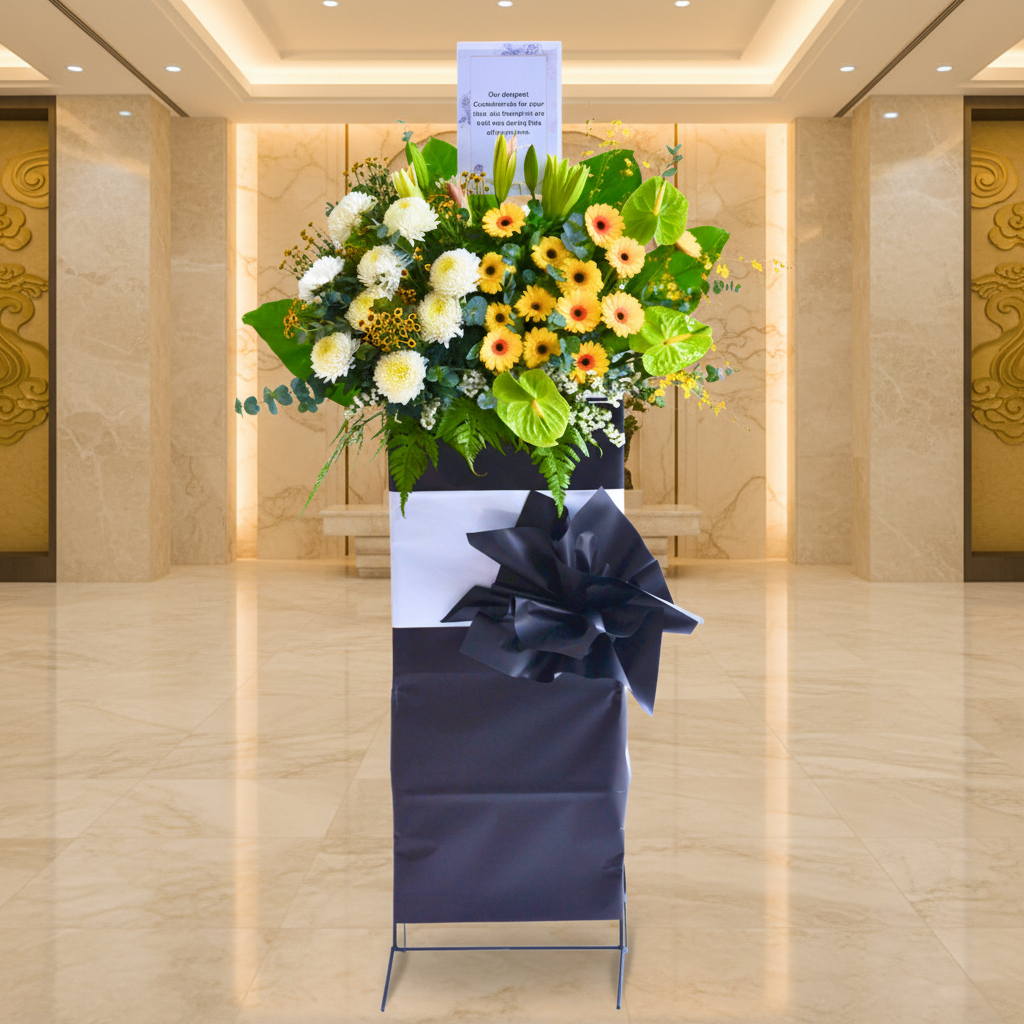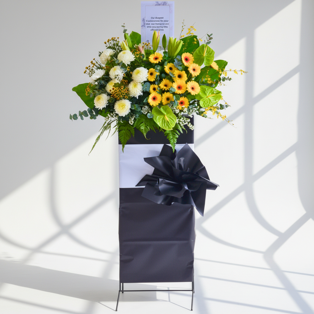 Embrace the warmth and solace of our yellow-themed condolences stand, elegantly showcased on a steel stand. This arrangement is composed of graceful rainforest leaves, delicate paper mums, vibrant yellow gerbera, and charming yellow mini pom poms. Enhanced by the elegance of statice, paku leaves, cineria, rainforest pancing lady, and green anthurium, it offers a serene serenade of sunshine, expressing heartfelt condolences and providing comfort during difficult times.