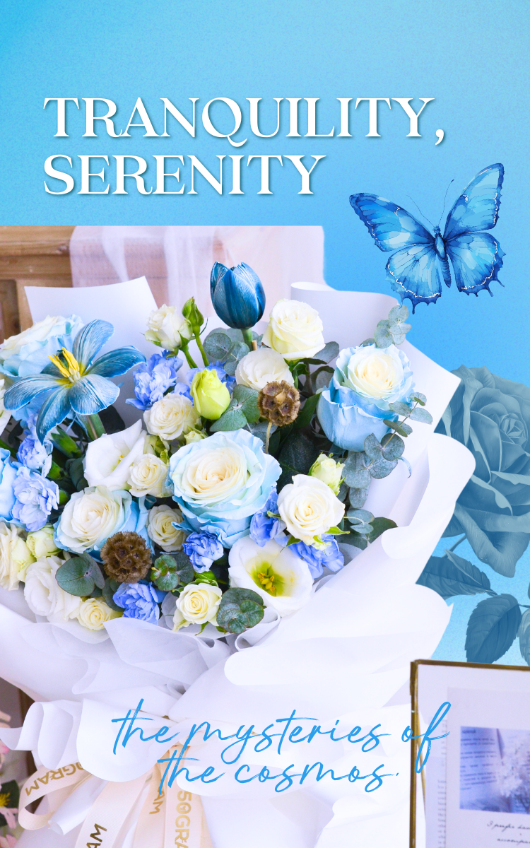 The captivating blue tulips, with their graceful curves and velvety petals, evoke feelings of peace, harmony, and spiritual awakening. Paired with the ethereal beauty of blue roses, representing love, intuition, and the infinite possibilities of the universe, and the delicate allure of miniature blue carnations, the bouquet becomes a celestial symphony of colors and textures.