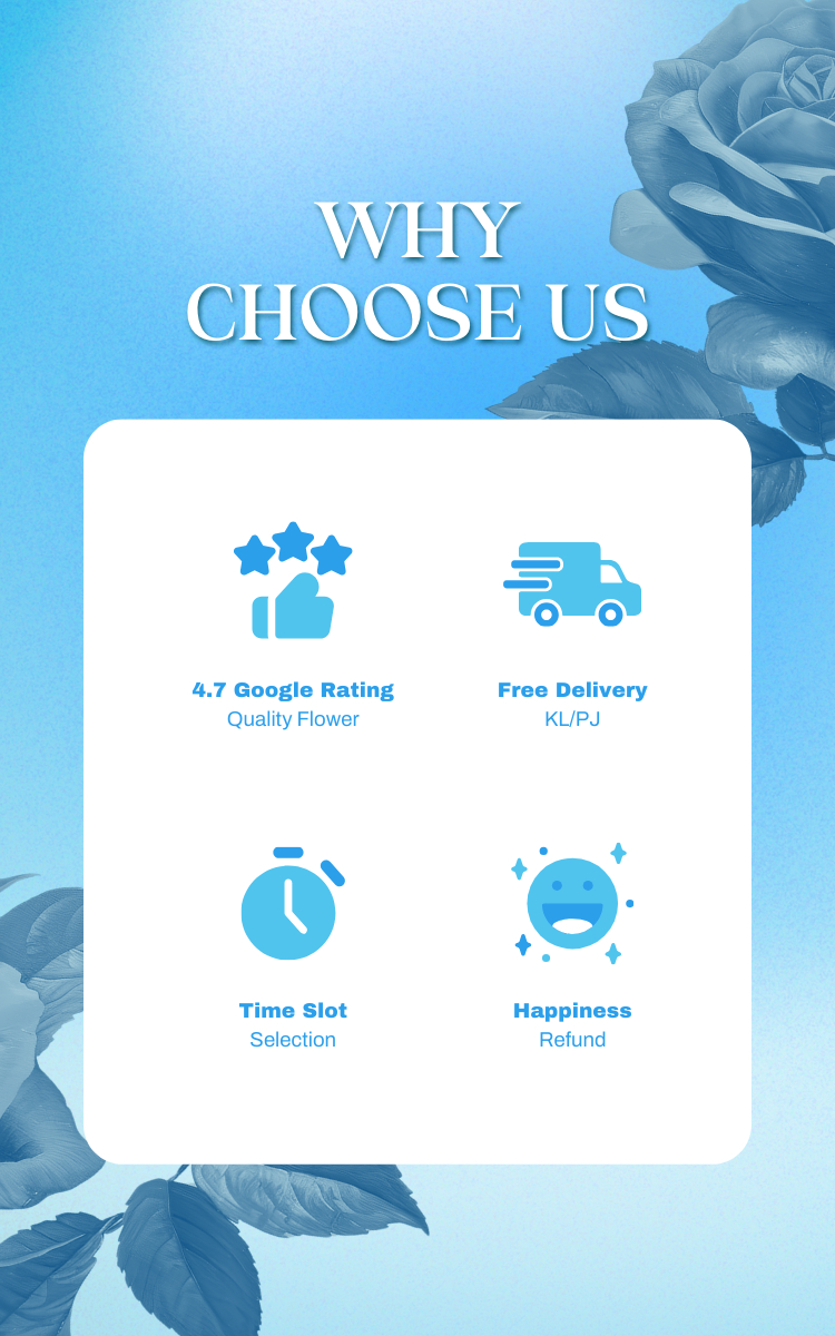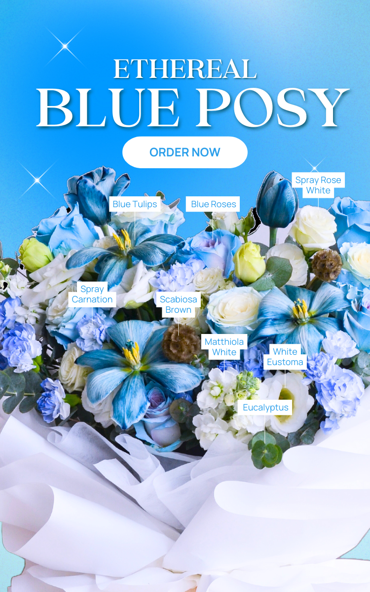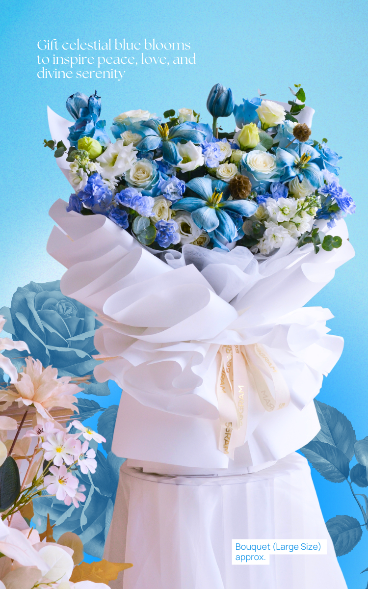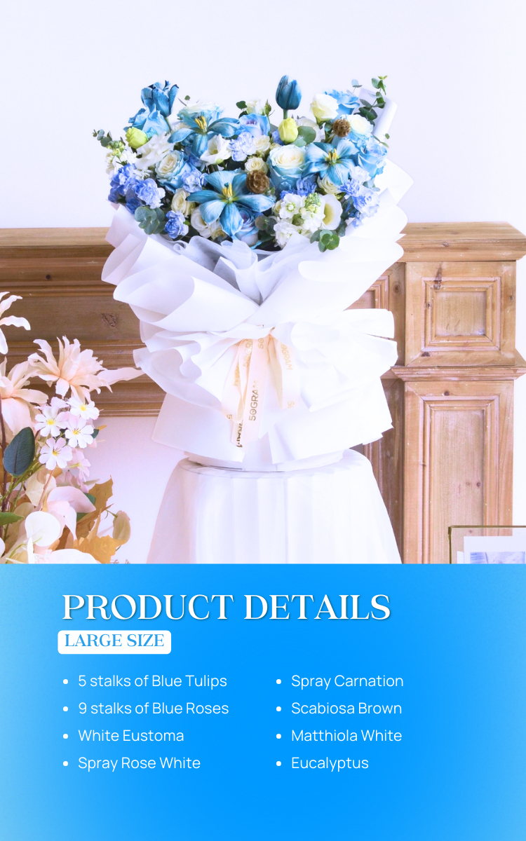 Large size comes with Blue Tulips x 5, Blue Roses x 9, White Eustoma, Spray Rose White, Spray Carnation, Scabiosa Brown, Matthiola White & Eucalyptus.