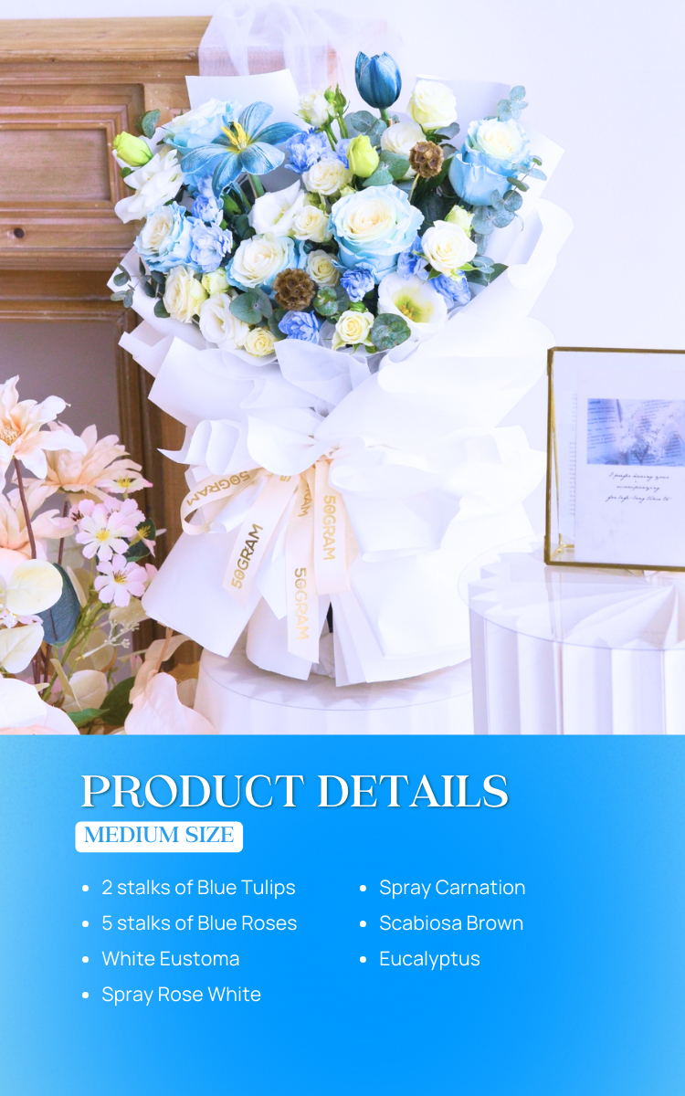 Medium size comes with Blue Tulips x 2, Blue Roses x 5, White Eustoma, Spray Rose White, Spray Carnation, Scabiosa Brown & Eucalyptus.