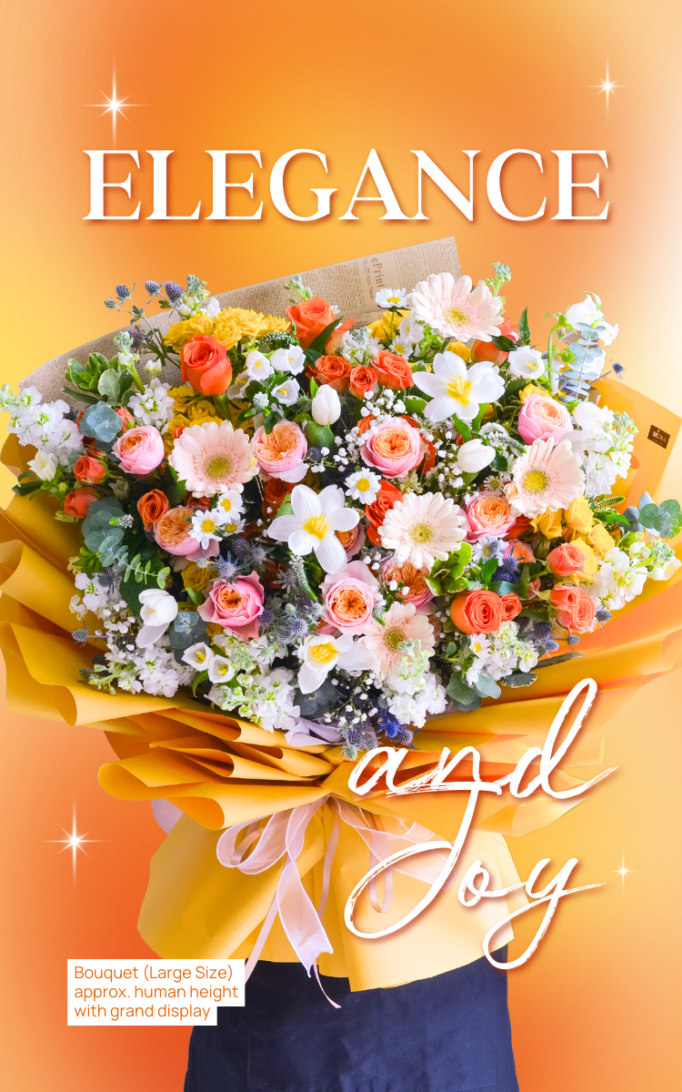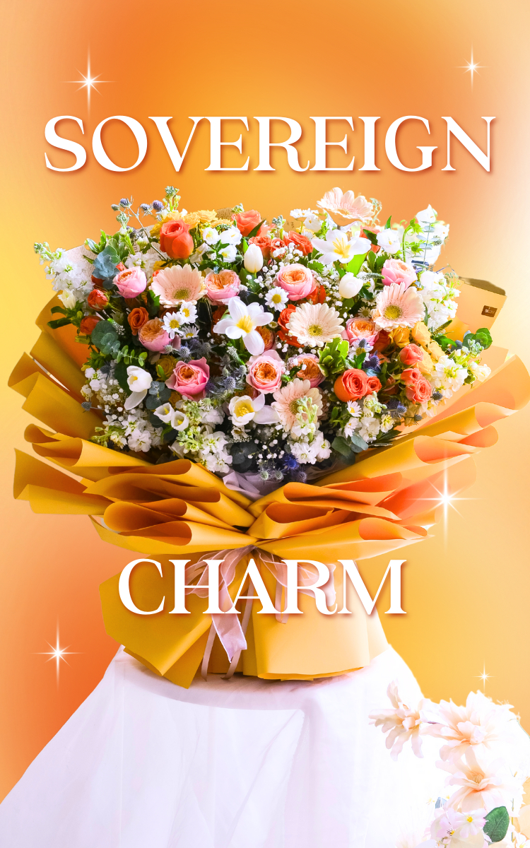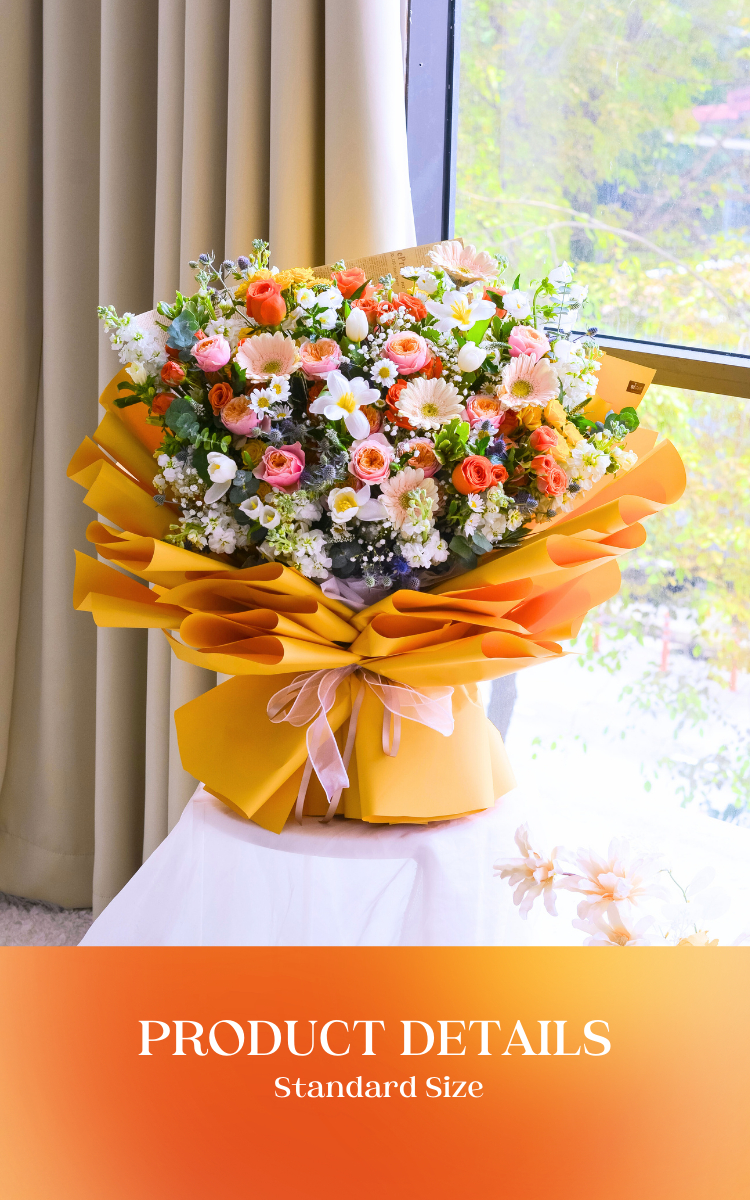 The “Sovereign Charm Hand Bouquet” is a vibrant and captivating arrangement that combines bold orange roses with soft pink roses and crisp white tulips. Accented by cheerful champagne daisies, mini orange roses, and delicate white matthiola, this bouquet also features the lightness of baby’s breath and the sunny touch of yellow mini roses. It embodies a blend of elegance and joy, making it perfect for celebrating special moments with a touch of royal charm. 🌹🌷🌼🤍